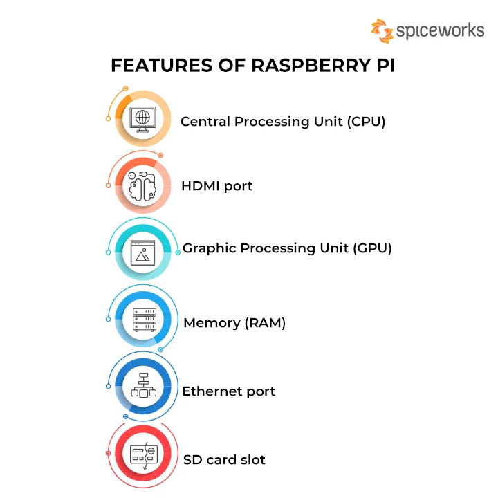 برای یک کاربر غیرحرفهای کامپیوتر، اولین برخورد با طرحهای رزبری پای میتواند کمی گیجکننده باشد. چندین ویژگی روی برد تعبیه شده است که هر کدام کاربردهای خاص خود را دارند. در مجموع، ویژگیهای مختلف، معیارهای کلی یک کامپیوتر استاندارد قرن بیست و یکم را کنترل میکنند: سرعت و کیفیت پردازنده، بلوتوث، پورتهای اتصال و لوازم جانبی و سازگاری نرمافزار. ویژگیهای کامپیوترهای رزبری پای که همه این موارد را ممکن میسازند عبارتند از: