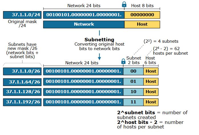حال، برای محاسبه مرزهای هر زیرشبکه، نمایش دودویی را به اعشاری تبدیل میکنیم. برای مثال، شناسه شبکه زیرشبکه اول 00100101.0000001.00000001.00000000 (37.1.1.0) و آدرس برادکست 00100101.00000001.00000001.00111111 (37.1.1.63) است. توجه داشته باشید که بیتهای شبکه به رنگ آبی و بیتهای میزبان به رنگ قرمز هستند. بیتهای شبکه 26 هستند - 24 بیت شبکه اصلی به علاوه 2 بیت زیرشبکه. بنابراین، برای زیرشبکه ۱: