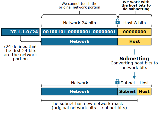 در مثال این درس، شبکه 37.1.1.0/24 را داریم. بنابراین، ماسک ۲۴ بیت طول دارد، به این معنی که ۲۴ بیت اول آدرس آیپی ۳۷.۱.۱.۰، همانطور که در شکل زیر نشان داده شده است، شبکه را شناسایی میکند. ۸ بیت آخر بخش میزبان را شناسایی میکنند. هنگام انجام زیرشبکهسازی، ما با بخش میزبان شبکه اصلی که به ما داده شده است کار میکنیم. ما به بخش شبکه اصلی دست نمیزنیم.