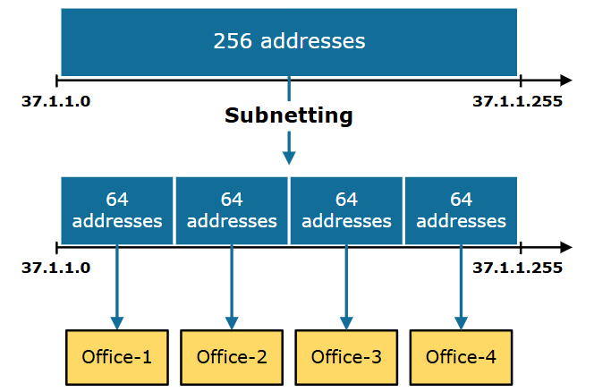 شکل بالا هدف زیرشبکه سازی IP را نشان میدهد - ما یک شبکه را به زیرشبکههای کوچکتر تقسیم میکنیم تا بتوانیم از فضای آدرس IP به طور کارآمدتری استفاده کنیم، که با توجه به تعداد محدود آدرسهای IPv4 موجود بسیار مهم است. به عنوان مثال، به جای اختصاص کل 37.1.1.0/24 به دفتر شماره 1 و گفتن به مدیریت برای خرید آدرسهای بیشتر، شبکه 37.1.1.0/24 را به چهار زیرشبکه کوچکتر تقسیم میکنیم و به هر دفتر یک زیرشبکه اختصاص میدهیم.
