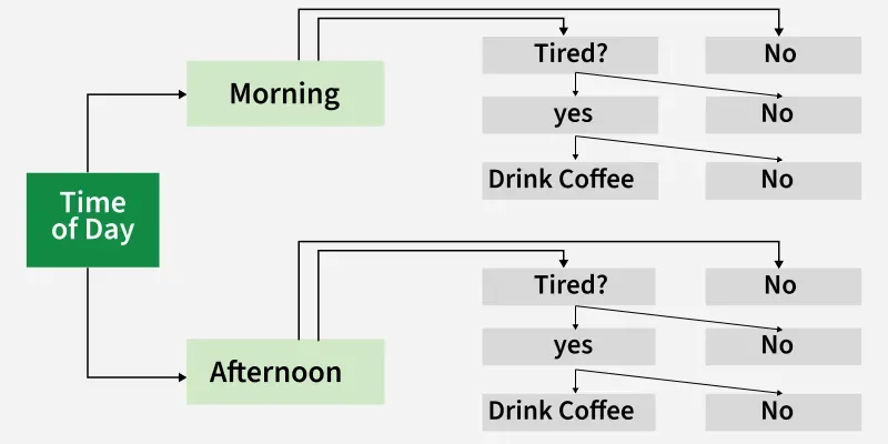 بیایید به یک مثال ساده نگاه کنیم تا نحوه کار آن را درک کنیم. تصور کنید که باید بر اساس زمان روز و میزان خستگی خود تصمیم بگیریم که آیا قهوه بنوشیم یا نه. درخت ابتدا زمان را بررسی میکند: