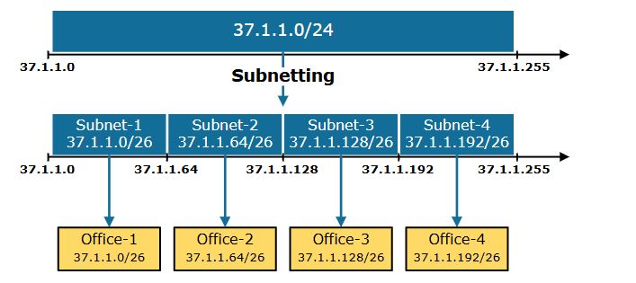 شکل بالا هدف زیرشبکه سازی IP را نشان میدهد - ما یک شبکه را به زیرشبکههای کوچکتر تقسیم میکنیم تا بتوانیم از فضای آدرس IP به طور کارآمدتری استفاده کنیم، که با توجه به تعداد محدود آدرسهای IPv4 موجود بسیار مهم است. به عنوان مثال، به جای اختصاص کل 37.1.1.0/24 به دفتر شماره 1 و گفتن به مدیریت برای خرید آدرسهای بیشتر، شبکه 37.1.1.0/24 را به چهار زیرشبکه کوچکتر تقسیم میکنیم و به هر دفتر یک زیرشبکه اختصاص میدهیم.