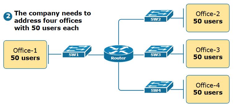 حالا میتوانیم هر یک از چهار زیرشبکه را به چهار دفتر اختصاص دهیم و آدرسهای IP کافی برای 50 کاربر در هر دفتر فراهم کنیم، همانطور که در شکل در زیر نشان داده شده است.