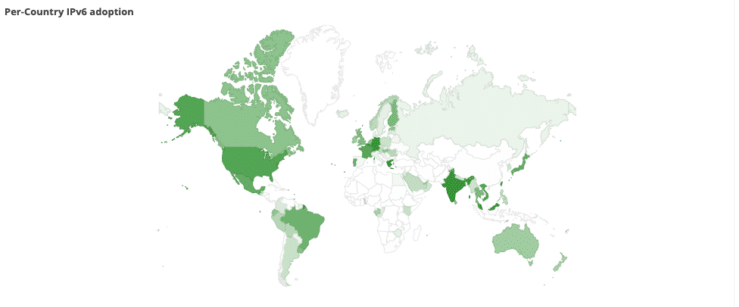 گوگل آمار عمومی مربوط به دسترسی کاربران گوگل به IPv6 را بر اساس کشورهای مختلف جهان نگهداری میکند. این اعداد، درصد کل ترافیک سایتهای گوگل است که از طریق IPv6 انجام میشود.